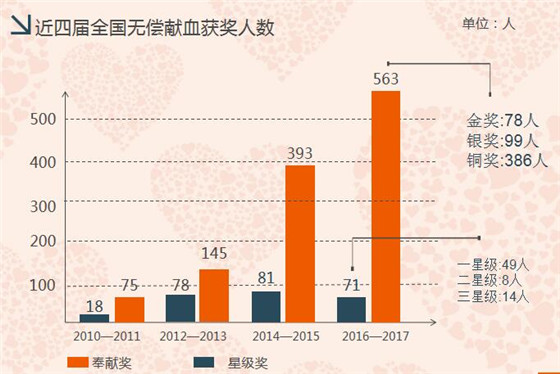 2016至2017年度安康申報全國獲獎人數(shù)634人次,其中:無償獻(xiàn)血奉獻(xiàn)獎計(jì)563人,金獎78人,銀獎99人,銅獎386人 ;全國星級志愿服務(wù)獎71人,一星級49人,二星級8人,三星級14人。連續(xù)五屆十年榮獲全國無償獻(xiàn)血先進(jìn)城市;安康職業(yè)技術(shù)學(xué)院被評為全國無償獻(xiàn)血促進(jìn)獎單位;我站站長胡章學(xué)被評為全國無償獻(xiàn)血促進(jìn)獎個人。獲獎人數(shù)創(chuàng)歷史新高。
