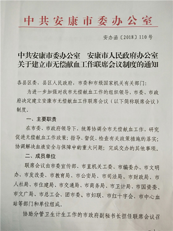 2、安康市率先在全省建立首個無償獻(xiàn)血聯(lián)系會議制度 安康無償獻(xiàn)血聯(lián)席會議制度是在安康市委、市政府領(lǐng)導(dǎo)下,由市委宣傳部等21個市級部門和單位組成,協(xié)助分管衛(wèi)生計(jì)生工作的市政府副秘書長擔(dān)任聯(lián)席會議召集人。聯(lián)席會議每年召開一次全體會議,主要職責(zé)為統(tǒng)籌協(xié)調(diào)全市無償獻(xiàn)血工作,研究促進(jìn)無償獻(xiàn)血工作相關(guān)政策,指導(dǎo)、督促、檢查有關(guān)政策措施的執(zhí)行落實(shí),協(xié)調(diào)解決血液安全與保障中的重大問題。聯(lián)系會議制度的建立,標(biāo)志著我市無償獻(xiàn)血宣傳招募模式“政府主導(dǎo)、部門協(xié)作、社會參與、城鄉(xiāng)聯(lián)動”的發(fā)展格局和長效機(jī)制得到進(jìn)一步鞏固和提升。