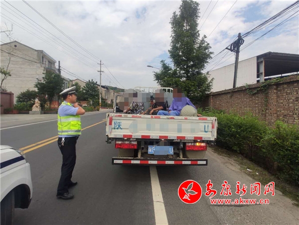 7月31日15時許,大隊(duì)執(zhí)勤民警在316國道沿線開展路面巡邏,行至恒口東大門時,發(fā)現(xiàn)一輛號牌為皖A(yù)C***C號輕型欄板貨車后車廂有違規(guī)載人嫌疑,巡邏民警立即上前攔停,示意駕駛?cè)死钅衬惩\嚱邮軝z查。經(jīng)查,該貨車核定載人數(shù)為5人,實(shí)際載9人,貨車車廂違法載客4人,屬于貨車違法載客的嚴(yán)重交通違法行為。