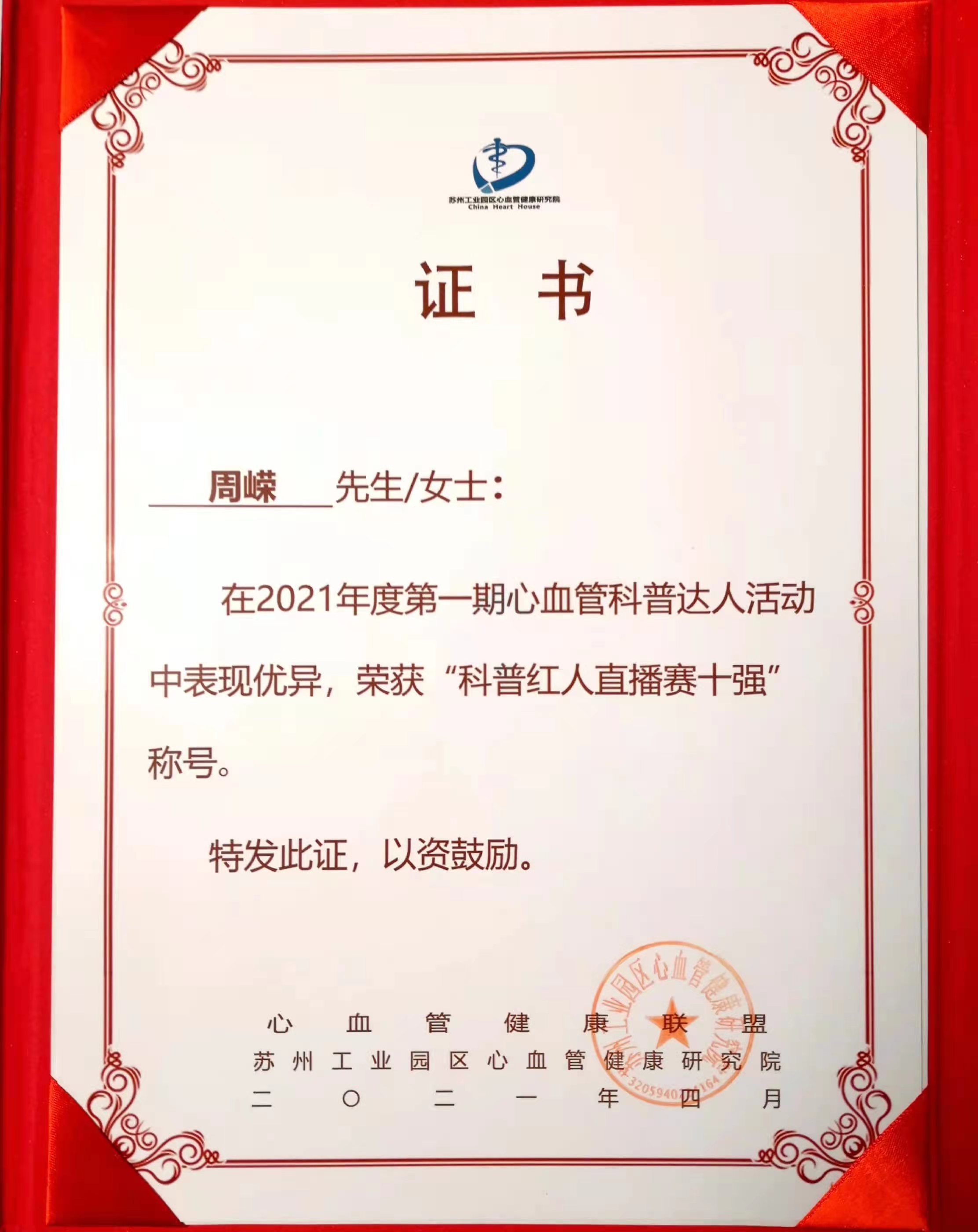 2021年 獲醫(yī)生云獎;獲“科普紅人直播賽十強”稱號