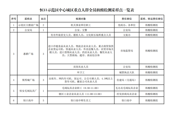 按行業(yè)、類別、區(qū)域,共設置19個采樣點、40個采樣臺(見附件),具體由各行業(yè)牽頭部門、責任單位統一安排采樣點設置、人員組織、秩序維護,檢測對象按照牽頭部門、責任單位的具體要求,分時段有序到指定地點進行采樣,避免人群聚集。