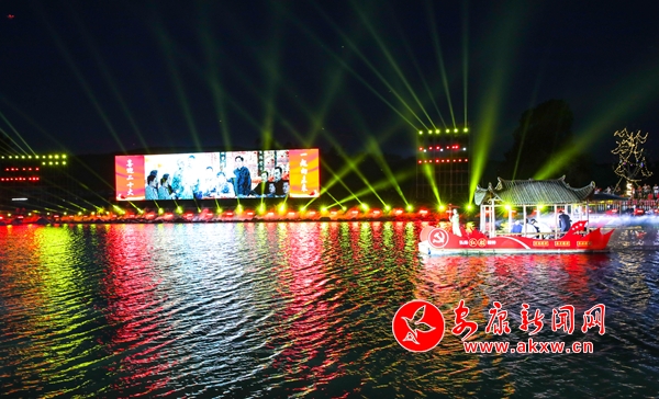 晚會在嘹亮激昂的獨(dú)唱《東方紅》中拉開序幕,緊接著,磅礴大氣的歌舞串燒《我和我的祖國》《萬疆》《愛我中華》,如詩如畫的水上表演《南湖紅船》《江南水鄉(xiāng)》《滾滾長江東逝水》,動力澎湃的RAP時(shí)尚秀《門戶新安康》,美輪美奐歌舞表演《我的深情為你守候》《為祖國干杯》《送你一個(gè)長安》《我愛你,中國》《領(lǐng)航》等節(jié)目相繼登臺表演,與此同時(shí),絢麗多彩的燈光秀和仙氣飄飄的霧森特效穿插其中,不斷將演出推向高潮。最后,整場演出在大合唱《沒有共產(chǎn)黨就沒有新中國》的歌聲中圓滿落下帷幕。