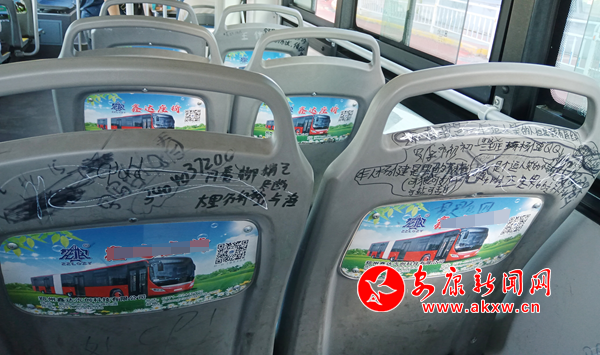 7月7日,筆者乘坐安康市城區(qū)7路公交車發(fā)現(xiàn),公交座椅靠背慘遭“涂鴉”,內(nèi)容不乏廣告標(biāo)語、低俗粗鄙、不堪入目的語言,嚴重影響乘車心情。希望廣大乘客文明乘車,還市民一個干凈整潔的乘車環(huán)境。(通訊員 成忠旭)