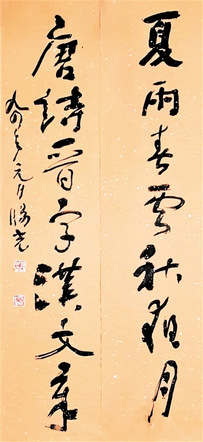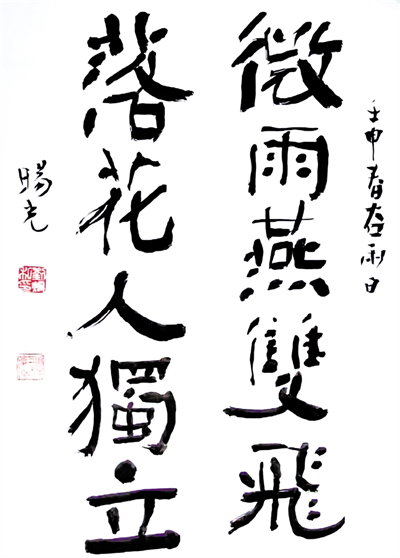 旸光先生淵博的家學(xué),深厚的學(xué)養(yǎng)為其書法技藝開(kāi)掘出流淌不盡的源泉,正是他那非凡的經(jīng)歷與盤踞胸中的郁勃之氣,鑄就了別具一格的藝術(shù)風(fēng)采。縱觀先生書法字里行間的布局、結(jié)構(gòu)、章法,即可以領(lǐng)略其高深的藝術(shù)修養(yǎng)。一般書法家給自己作品題款尚膽怯,更何況給山水畫人物、花鳥(niǎo)畫題款署名,書寫跋語(yǔ),要求書者不但有深厚的文學(xué)功底賦詞作詩(shī),再根據(jù)畫面的風(fēng)格,畫中所留空白虛實(shí)照應(yīng),用筆用墨的變化去應(yīng)對(duì),好的款跋使作品升華。而先生無(wú)論行、草、隸、篆,縱橫涂抹,信手拈來(lái)如行云流水,宛若天成,令人折服,先生曾為不少后學(xué)作品撰寫款名,跋語(yǔ)至今記憶猶新。