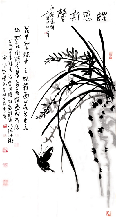 1988年,中國(guó)畫壇號(hào)稱“蝶王”的王冰如女士,以80歲高齡回到她曾工作生活10年之久的第二故鄉(xiāng)安康舉辦畫展,并且以詩(shī)書畫會(huì)友,特邀旸光先生和金州著名詩(shī)人劉寅初老人同游香溪,冰如老師興之所至,巧繪墨蝶,說(shuō)道“人言寅初老弟有曹子健七步成詩(shī)之才,今日以十步為限,將此畫為題,賦詩(shī)一首,旸光老弟書于其上如何?”寅初老只走了三步便道有了,于是順口吟誦,旸光先生揮毫急就“花中仙子蝶中王,蝶舞籣叢花更香,化蝶莊周終是夢(mèng),喜看蝶王飛安康?!币还P流暢的行草躍然于畫上,相輔相成,真是詩(shī)情畫意天作之合。一幅難遇難得難覓的“三絕圖”誕生了。冰如老師感慨萬(wàn)千,說(shuō)到“二位弟臺(tái)才高八斗,只可惜待在安康這個(gè)貧瘠的地方被埋沒(méi)了也!”這個(gè)場(chǎng)面是一種巧合,正是旸光先生“萬(wàn)事隨緣”的結(jié)晶,爾后經(jīng)書壇大家陳少默先生為之題跋做款,更是錦上添花,成了四絕圖。冰如、少默、旸光、寅初先生已然作古,這段翰墨丹青之情,將永存世間傳為藝術(shù)佳話。