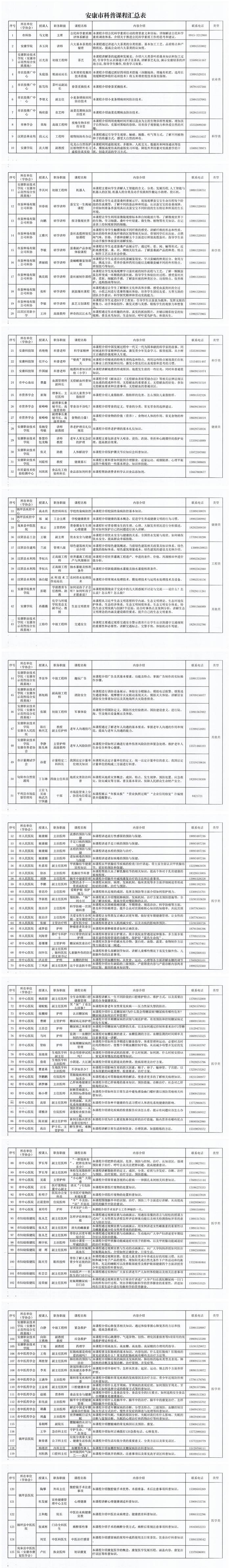 為認真落實《安康市貫徹<全民科學(xué)素質(zhì)行動規(guī)劃綱要(2021-2035年)實施方案》,增強我市科普供給能力,助力提升全民科學(xué)素質(zhì),經(jīng)前期征集、審核整理,形成了安康市科普課程,共計125門課,內(nèi)容包括但不限于科學(xué)技術(shù)、農(nóng)業(yè)技術(shù)、工程技術(shù)、衛(wèi)生保健、生態(tài)環(huán)保、應(yīng)急處置、運動健康、生活常識、網(wǎng)絡(luò)安全等科普知識?,F(xiàn)將安康市科普課程予以公布,并就有關(guān)事項通知如下: