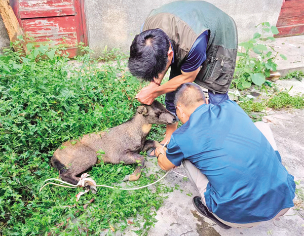 有著多次救助野生動物經(jīng)驗的八仙保護站站長鄒奎兵,一邊安撫驚恐不安的野羊,一邊聯(lián)系當(dāng)?shù)孬F醫(yī)準備救治。針劑急救,傷口處理,很快就緒,并臨時安置在千家坪林場廢棄的場院中。