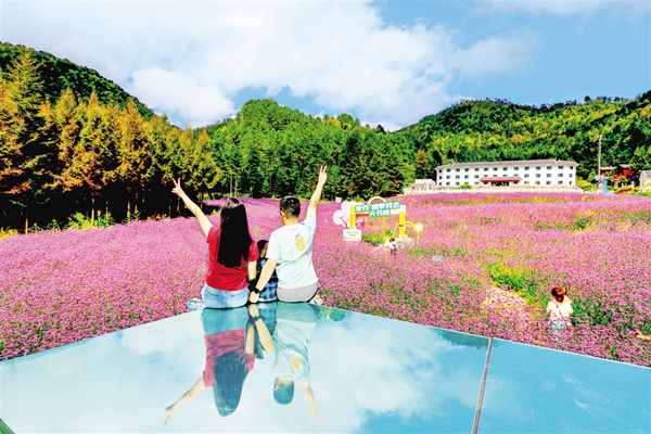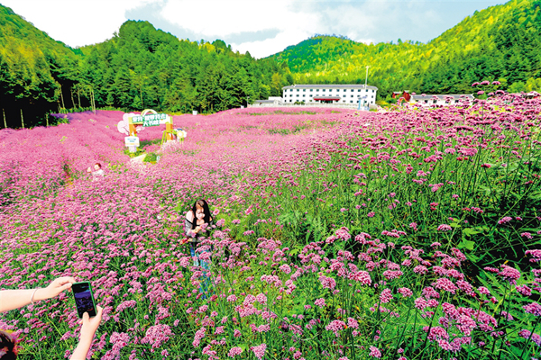 中秋節(jié)期間,平利千家坪森林公園天書(shū)峽馬鞭草花競(jìng)相怒放。如畫(huà)的景色吸引眾多游客前來(lái)賞景打卡。(詹永桂 攝)