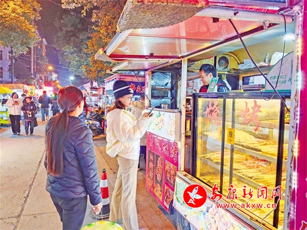 暮色起,華燈上。位于縣城河街美食、建設(shè)路夜市步行街里人潮涌動,商家的吆喝聲、食客的談笑聲……融匯成夜間的熱鬧景象。不少市民和游客在這里尋味美食,有的駐足在攤位前交談、有的在品嘗美食、有的掃碼付款,在味蕾與煙火氣的碰撞之中感受著縣城的年味。