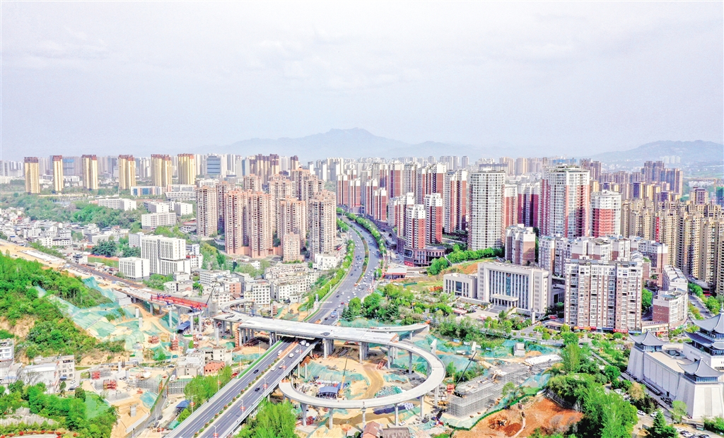 4月9日,航拍鏡頭下的七里溝立交橋項(xiàng)目。 周亭松 攝