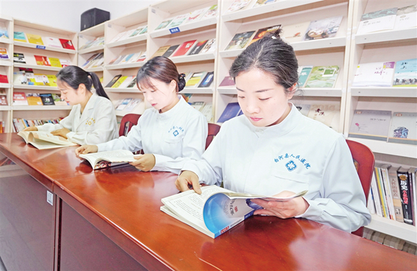 4月23日,白河縣人民醫(yī)院護(hù)士利用工作間隙在圖書角專注閱讀。(伍渭康 攝)??