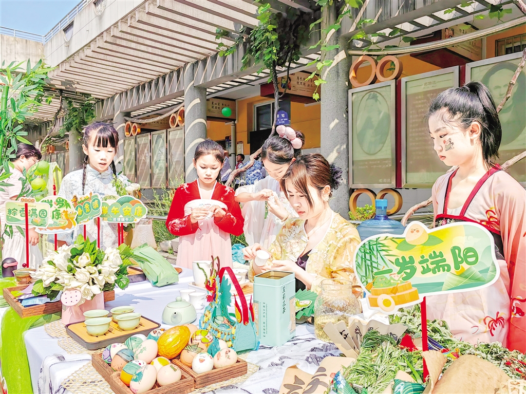 學(xué)生們身著漢服與“我們的節(jié)日·端午”主題文化節(jié)背景墻合影