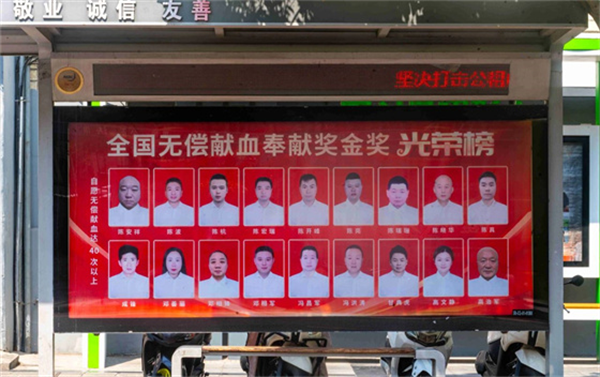 在第22個(gè)世界獻(xiàn)血者日到來之際,安康市中心血站精心策劃,自6月中旬起,在位于市政務(wù)大廳、市中心醫(yī)院、市中心醫(yī)院北院區(qū)門前的三處公交候車亭,以及中心城區(qū)兩處LED大屏上,全天循環(huán)展播著安康市榮獲“全國無償獻(xiàn)血奉獻(xiàn)獎(jiǎng)”終身榮譽(yù)獎(jiǎng)、金獎(jiǎng)、銀獎(jiǎng)、銅獎(jiǎng)的獲獎(jiǎng)?wù)叽盹L(fēng)采照片。