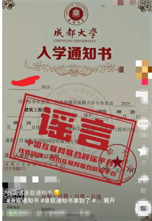 教育部多次提醒,部分機構(gòu)和個人打著普通高等學歷教育幌子,實際卻為自考助學、網(wǎng)絡(luò)教育等其他教育形式,或進行虛假宣傳。如未通過高考招生錄取獲得正式通知書,無法注冊普通高校正式學籍,也無法取得普通高等學校學歷證書。考生及家長應通過正規(guī)渠道核驗錄取信息,嚴格保護個人信息,防止被不法分子利用。(來源:四川互聯(lián)網(wǎng)舉報辟謠平臺、成都網(wǎng)絡(luò)辟謠)