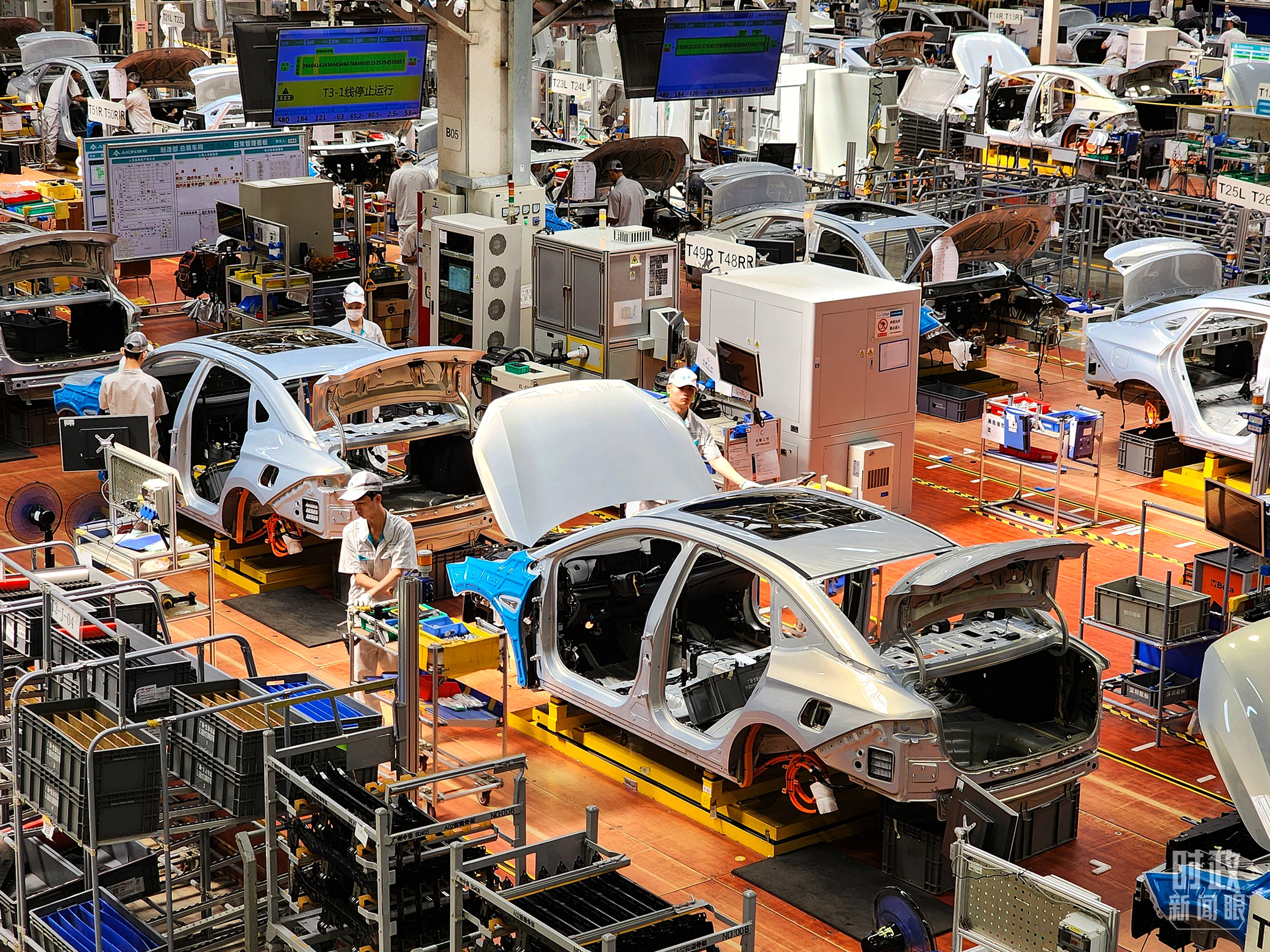 △國(guó)內(nèi)一家車(chē)企制造車(chē)間的新能源汽車(chē)生產(chǎn)線。(圖/視覺(jué)中國(guó))