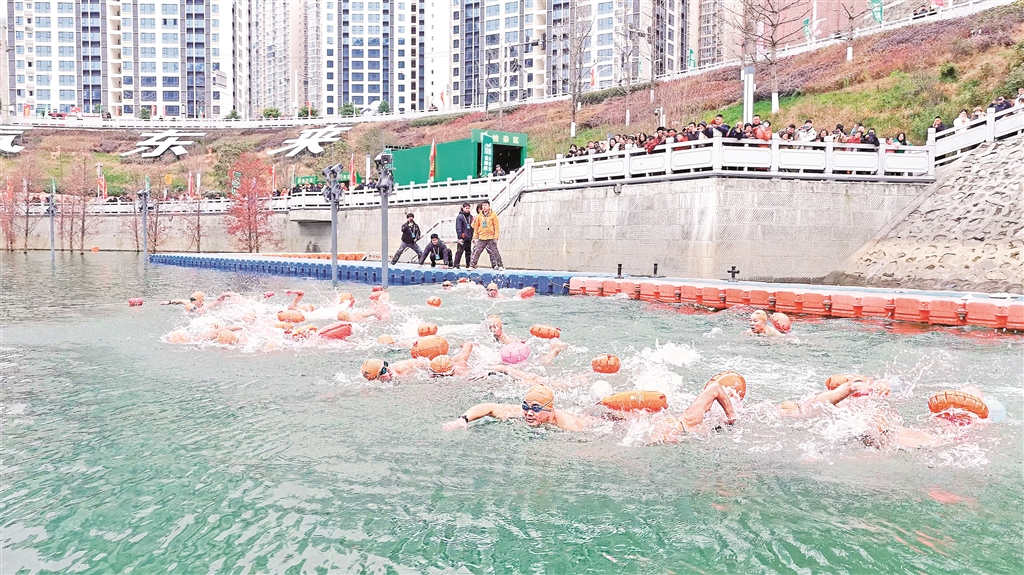 12月21日,陜西省第八屆漢江公開水域冬泳賽在紫陽縣月畔灣廣場水域舉行。當(dāng)天,來自陜西、湖北、四川、重慶、河南、內(nèi)蒙古自治區(qū)的44支代表隊400余名運動員報名參賽。(儲茂銀 攝)