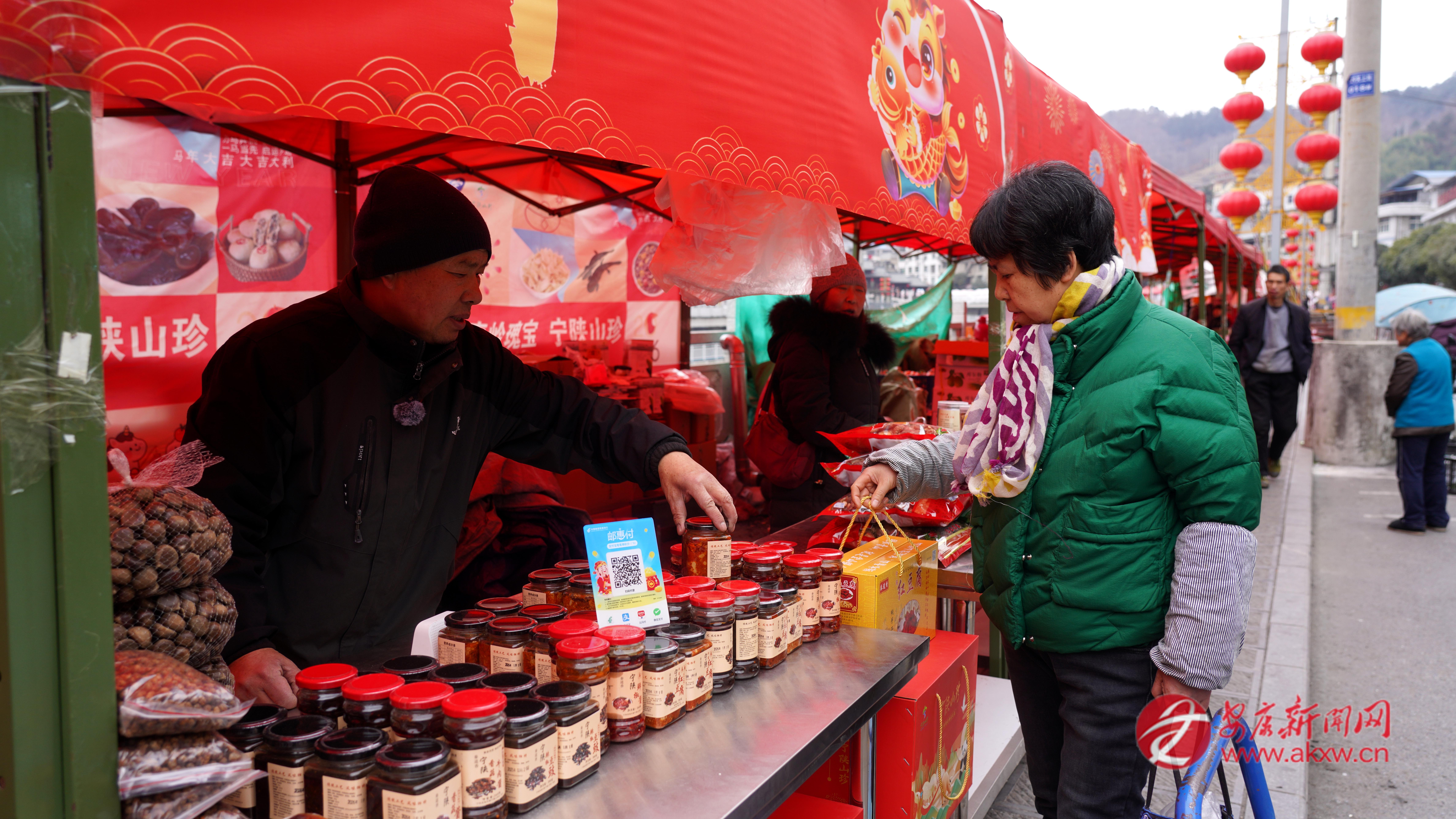 在寧陜縣城河堤?hào)|街的“年貨大集”,134個(gè)攤位整齊排布,本地臘肉油亮誘人、野生香菇厚實(shí)飽滿(mǎn)、土蜂蜜晶瑩剔透、木耳如墨玉般堆疊;新衣、玩具、春聯(lián)、中國(guó)結(jié)琳瑯滿(mǎn)目,一片喜慶祥和的景象。