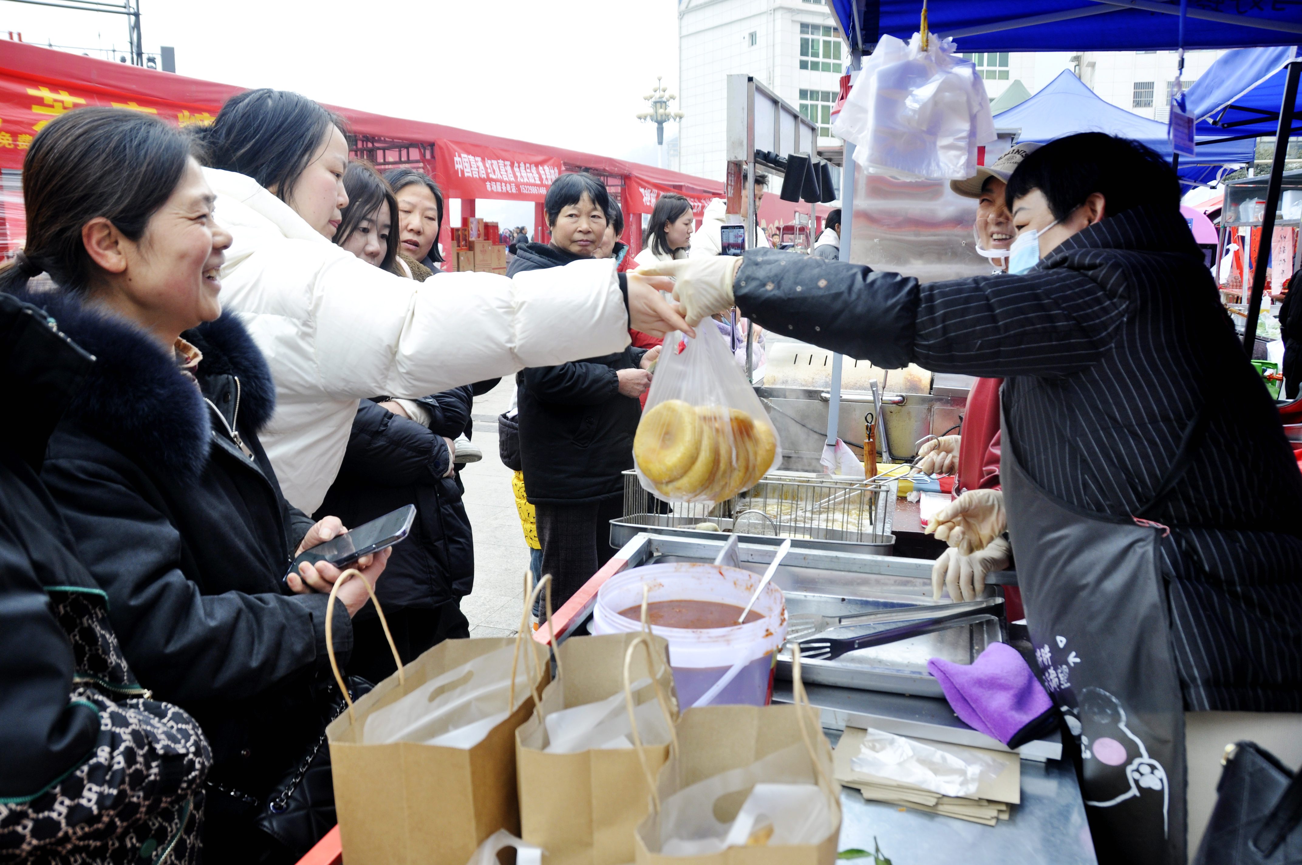 節(jié)日里的紫陽縣城一派繁榮祥和,圖為市民在頗有名氣的煥古高老二的油糍攤前排隊(duì)購(gòu)買。彭召伍 攝